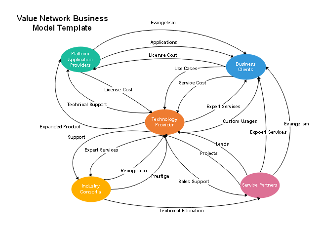 This value network business model template offers a professional business analysis perspective for the technical resources, platform applications, business clients, service partners, and industry consortia. Feel free to change the color or the text of this template.