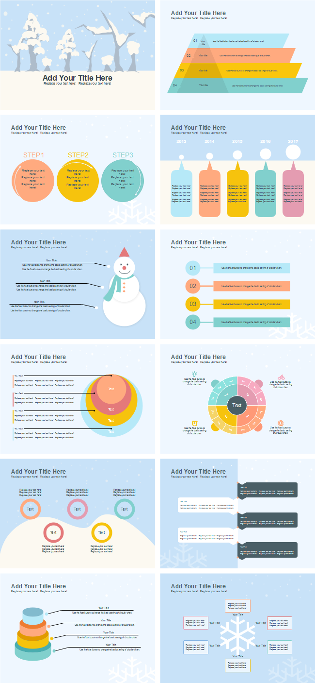 The winter snowman presentation template features colorful text blocks and winter design elements such as snowman and snowflake. It can help catch and hold attention of your audience. Use Edraw's extensive symbols library for a more personalized look.